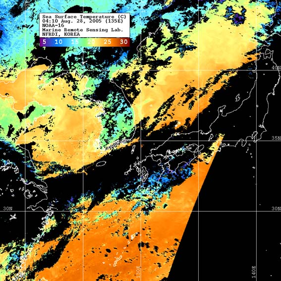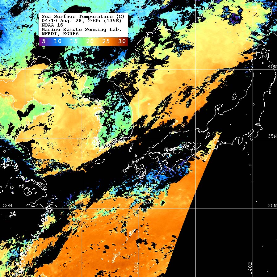 o 2005년 08월 28일 04시 10분 NOAA-16호 위성영상입니다. o 수온분포는 범례를 참고하시기 바랍니다. o 검은색은 구름 또는 육지를 나타냅니다.