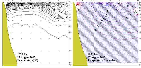 ◦ 2005년 8월 27일 국립수산과학원 동해수산연구소에서 조사한 105선(동해 동방)의 수직수온분포도 및 평년편차도입니다.
