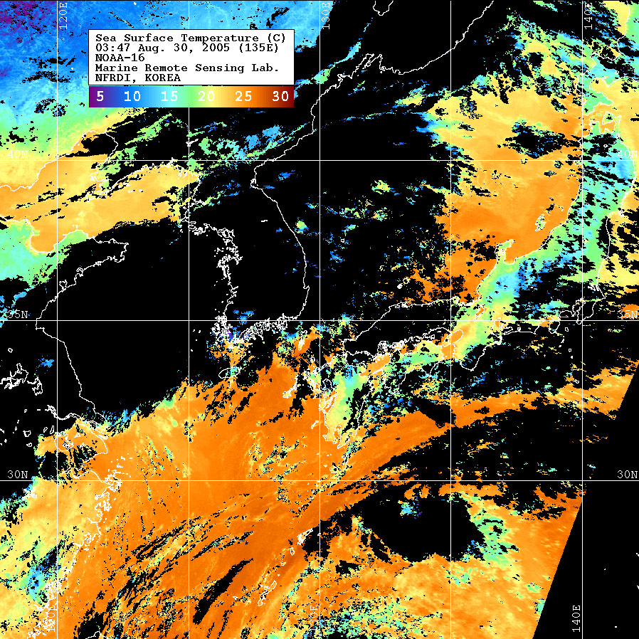 o 2005년 08월 30일 03시 47분 NOAA-16호 위성영상입니다. o 수온분포는 범례를 참고하시기 바랍니다. o 검은색은 구름 또는 육지를 나타냅니다.