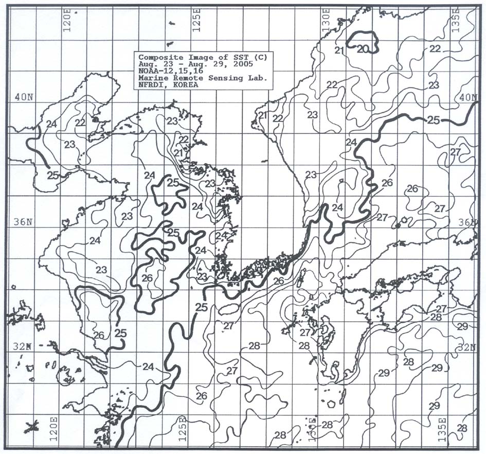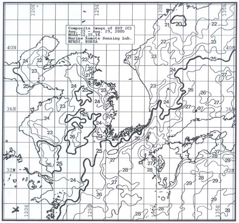 o 금주 (2005.08.23~08.29)의 한국근해 표면수온은 대화퇴 근해 섭씨 24~26도, 울릉도 근해 23~25도, 대마도 근해 26~28도, 제주도 근해 25~27도, 이어도 근해 24~26도, 일향초 근해 및 어청도 근해 24~26도 내외로 나타납니다. o「평년에 비해」 대화퇴 근해 1.5도 높게, 울릉도 근해 비슷하게, 대마도 근해 1.5도 높게, 제주도 근해 0.5도 낮게, 이어도 근해 2도 낮게, 일향초 근해 1도 낮게, 어청도 근해는 비슷하게 나타납니다. o 수온 전선대는 제주해협과 대한해협 서수도간 해역에서 25도를 중심으로 형성됩니다. < 위의 그림을 클릭하시면 확대된 수온정보를 보실 수 있습니다 >