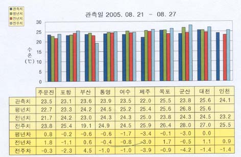 o 금주(2005.08.21~08.27)의 한반도 연안 표면수온은 동해 연안역에서 섭씨 22~24도, 남해 연안역에서 22~24도, 서해 연안역에서 23~25도 내외로 나타납니다.
