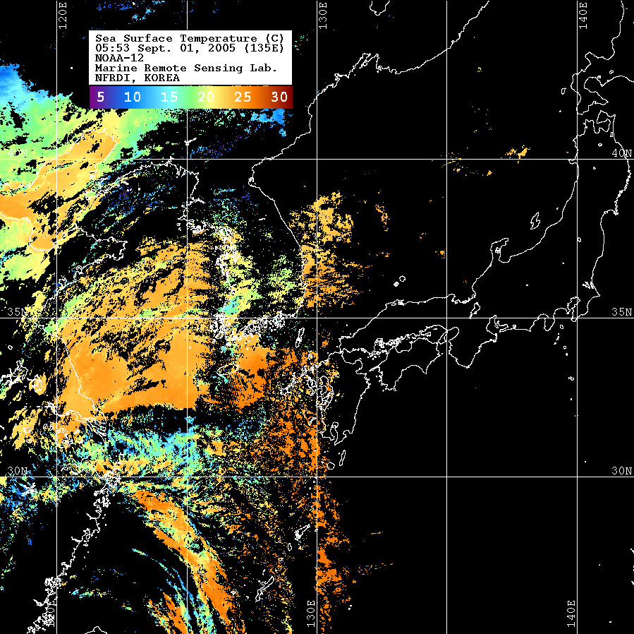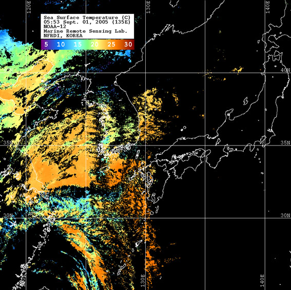o 2005년 09월 01일 05시 53분 NOAA-12호 위성영상입니다. o 수온분포는 범례를 참고하시기 바랍니다. o 검은색은 구름 또는 육지를 나타냅니다.