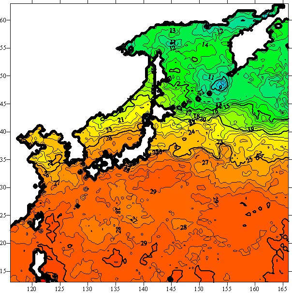o 2005년 08월 31일 북서태평양 광역해양 수온분포 입니다.