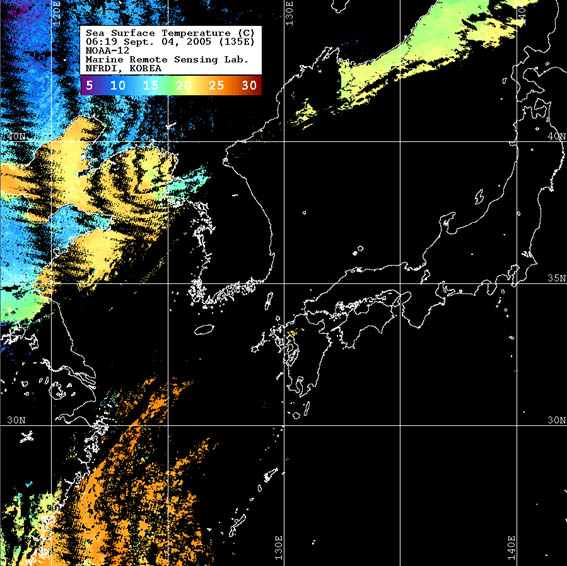 o 2005년 09월 04일 06시 19분 NOAA-12호 위성영상입니다. o 수온분포는 범례를 참고하시기 바랍니다. o 검은색은 구름 또는 육지를 나타냅니다.