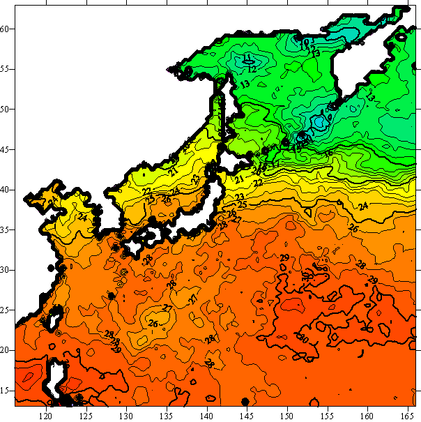 o 2005년 09월 06일 북서태평양 광역해양 수온분포 입니다.