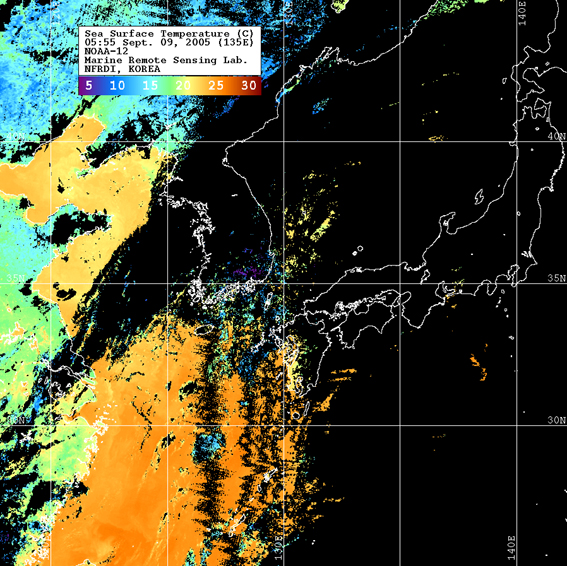 o 2005년 09월 09일 05시 55분 NOAA-12호 위성영상입니다. o 수온분포는 범례를 참고하시기 바랍니다. o 검은색은 구름 또는 육지를 나타냅니다.