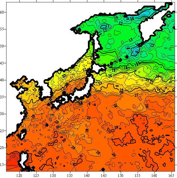o 2005년 09월 08일 북서태평양 광역해양 수온분포 입니다.