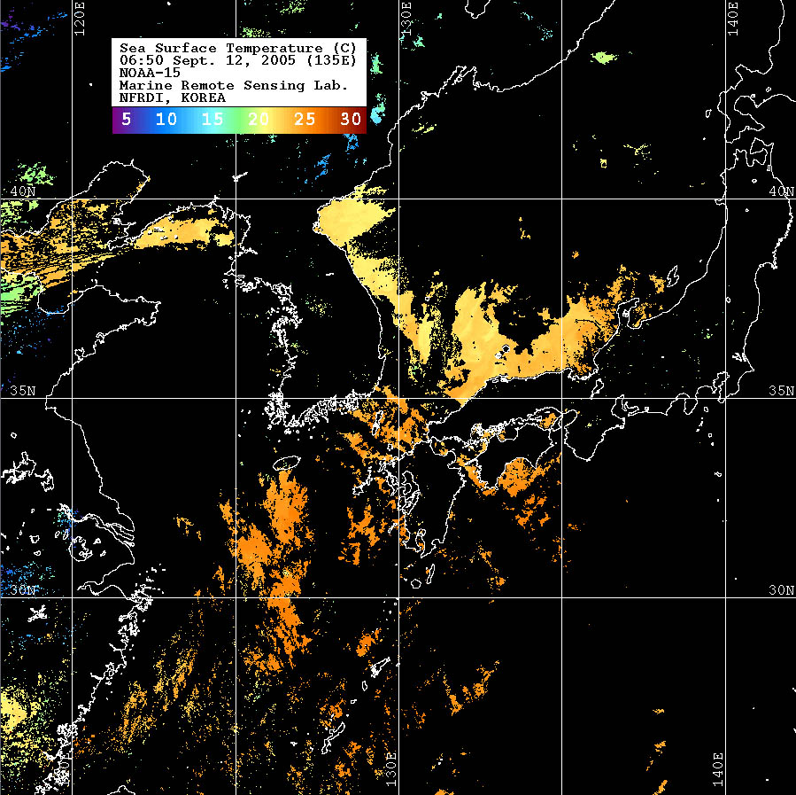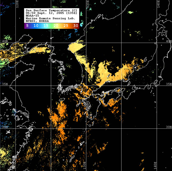 o 2005년 09월 12일 06시 50분 NOAA-15호 위성영상입니다. o 수온분포는 범례를 참고하시기 바랍니다. o 검은색은 구름 또는 육지를 나타냅니다.
