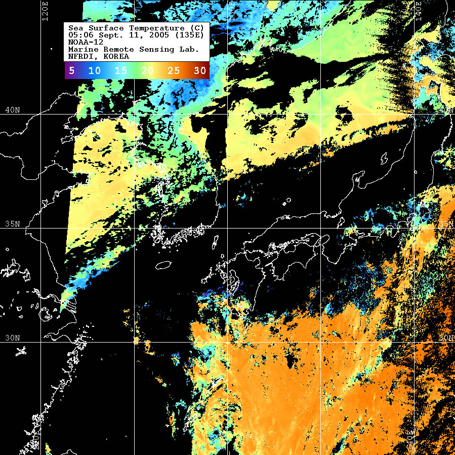 o 2005년 09월 11일 05시 06분 NOAA-12호 위성영상입니다. o 수온분포는 범례를 참고하시기 바랍니다. o 검은색은 구름 또는 육지를 나타냅니다.