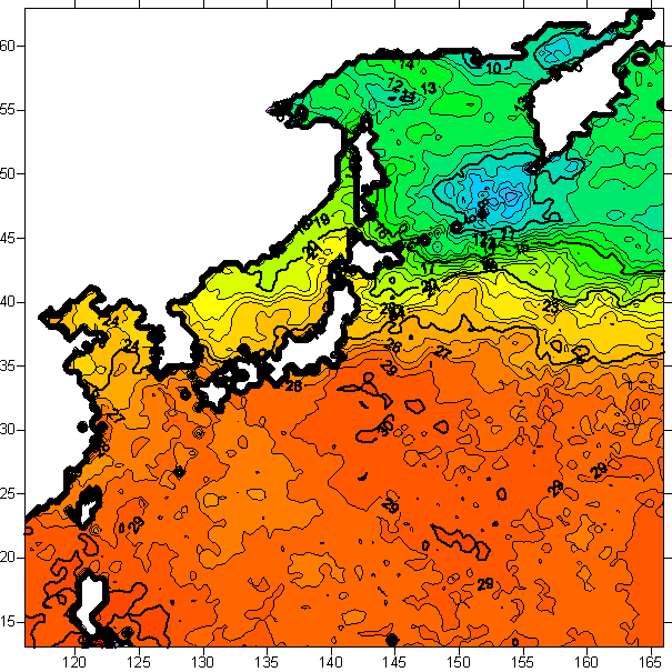 o 2005년 09월 12일 북서태평양 광역해양 수온분포 입니다.