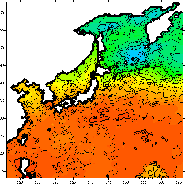 o 2005년 09월 13일 북서태평양 광역해양 수온분포 입니다.