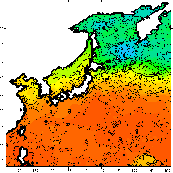 o 2005년 09월 14일 북서태평양 광역해양 수온분포 입니다.