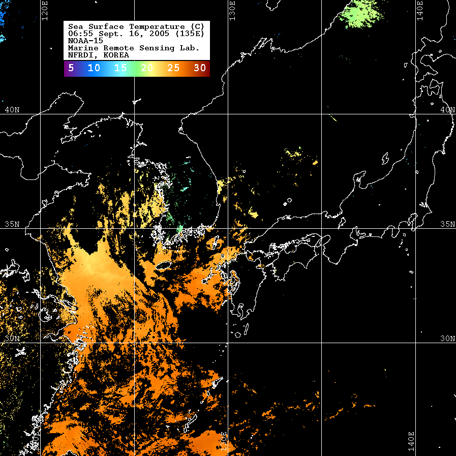 o 2005년 09월 16일 06시 55분 NOAA-15호 위성영상입니다. o 수온분포는 범례를 참고하시기 바랍니다. o 검은색은 구름 또는 육지를 나타냅니다.