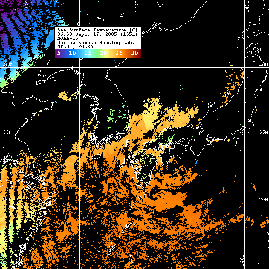 o 2005년 09월 17일 06시 30분 NOAA-15호 위성영상입니다. o 수온분포는 범례를 참고하시기 바랍니다. o 검은색은 구름 또는 육지를 나타냅니다.