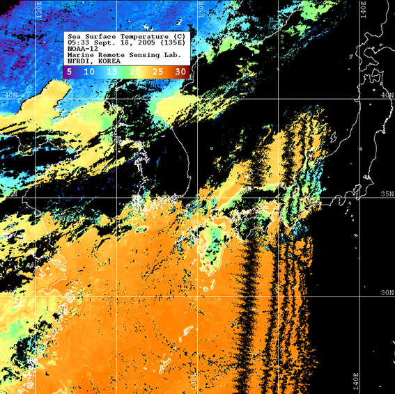 o 2005년 09월 18일 05시 33분 NOAA-12호 위성영상입니다. o 수온분포는 범례를 참고하시기 바랍니다. o 검은색은 구름 또는 육지를 나타냅니다.