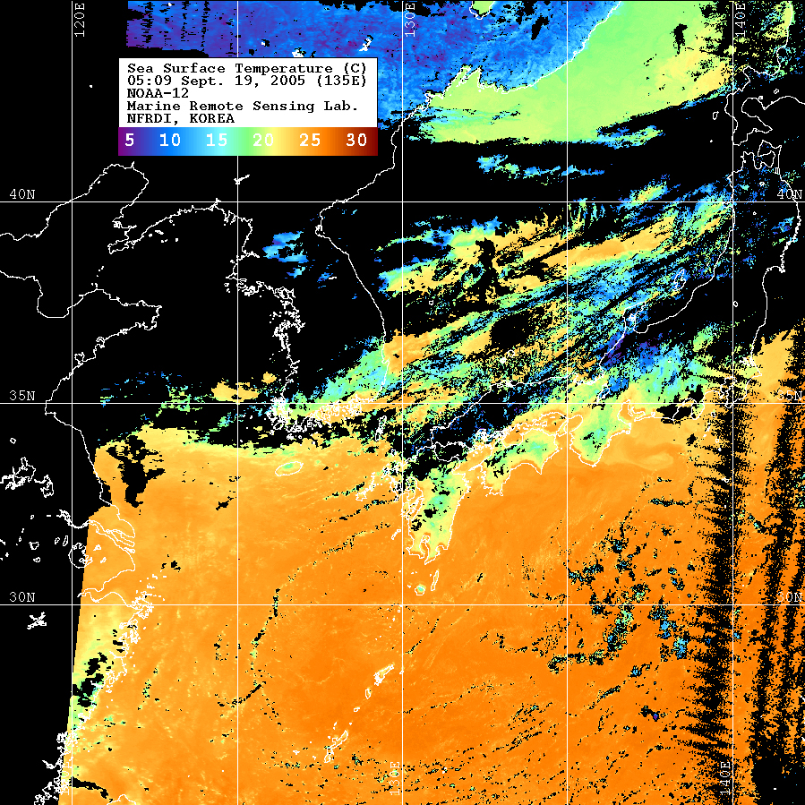 o 2005년 09월 19일 05시 09분 NOAA-12호 위성영상입니다. o 수온분포는 범례를 참고하시기 바랍니다. o 검은색은 구름 또는 육지를 나타냅니다.