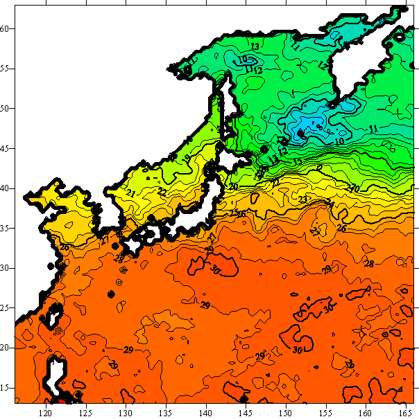 o 2005년 09월 18일 북서태평양 광역해양 수온분포 입니다.