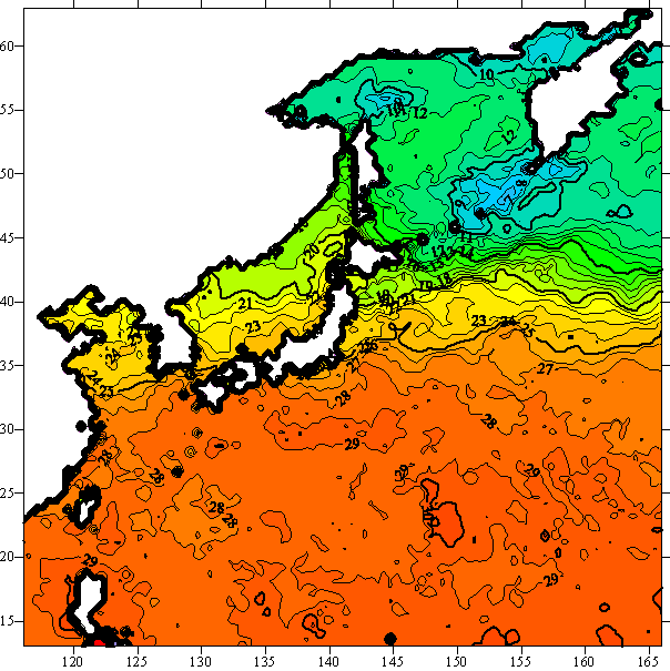 o 2005년 09월 21일 북서태평양 광역해양 수온분포 입니다.