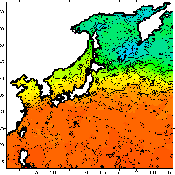 o 2005년 09월 22일 북서태평양 광역해양 수온분포 입니다.