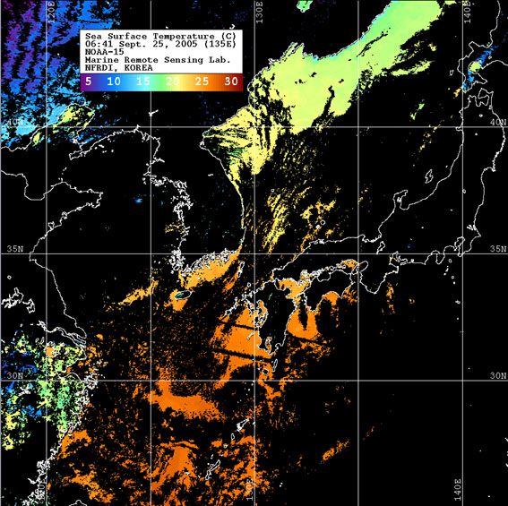 o 2005년 09월 25일 06시 41분 NOAA-15호 위성영상입니다. o 수온분포는 범례를 참고하시기 바랍니다. o 검은색은 구름 또는 육지를 나타냅니다.