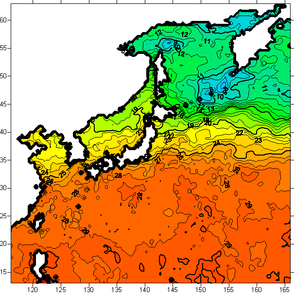 o 2005년 09월 23일 북서태평양 광역해양 수온분포 입니다.