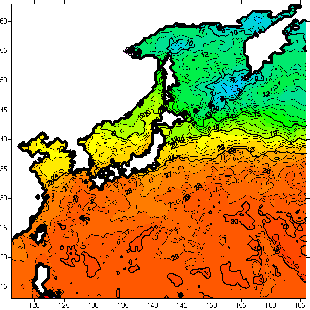 o 2005년 09월 25일 북서태평양 광역해양 수온분포 입니다.