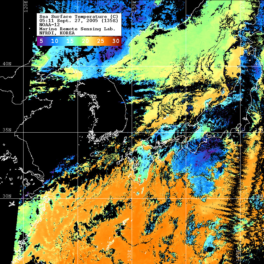 o 2005년 09월 27일 05시 11분 NOAA-12호 위성영상입니다. o 수온분포는 범례를 참고하시기 바랍니다. o 검은색은 구름 또는 육지를 나타냅니다.