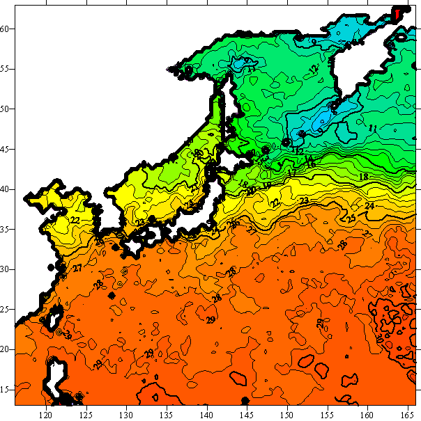 o 2005년 09월 26일 북서태평양 광역해양 수온분포 입니다.