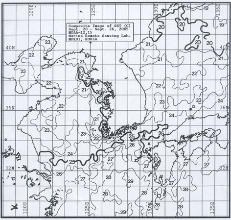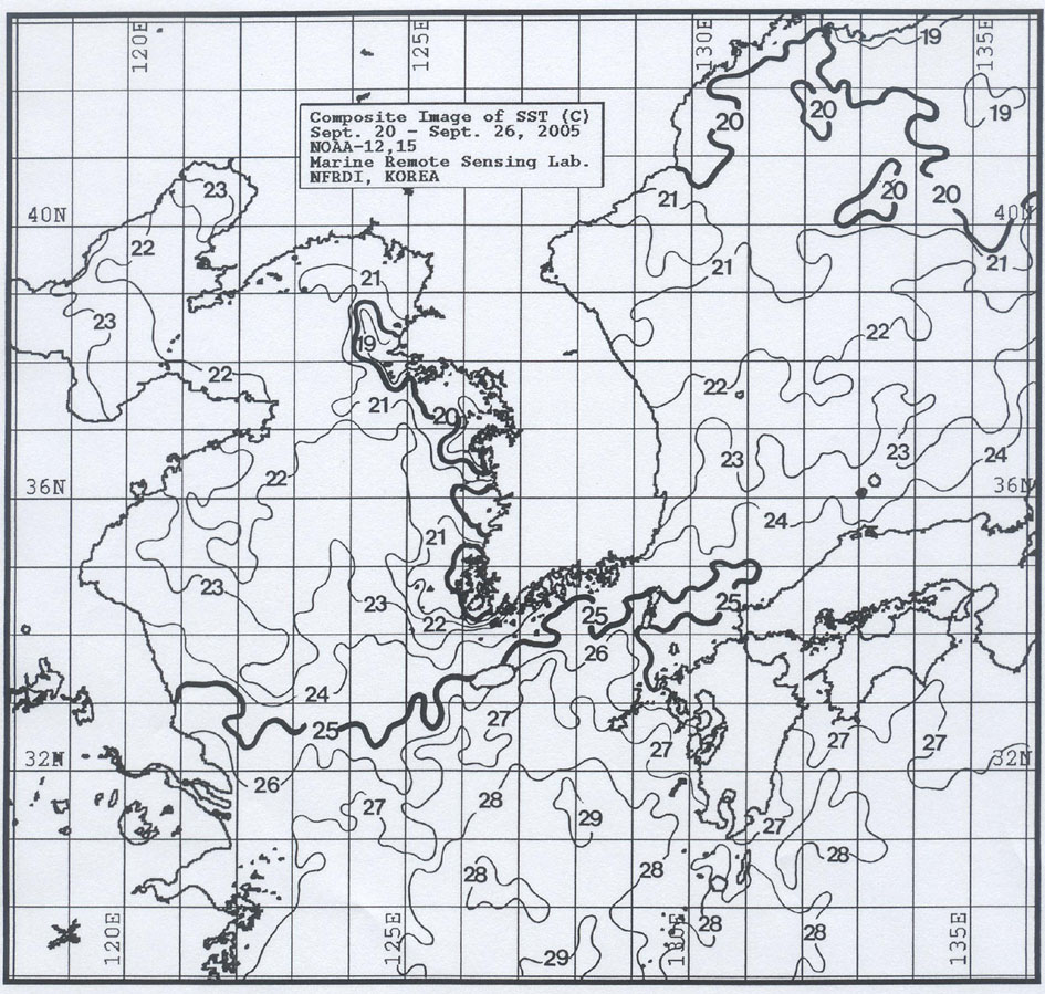 o 금주 (2005.09.20~09.26)의 한국근해 표면수온은 대화퇴 20~22도, 울릉도 근해 21~23도, 대마도 및 제주도 근해 24~26도, 이어도 근해 25~26도, 일향초 근해 23~24도, 어청도 근해 19~20도 내외로 나타납니다.