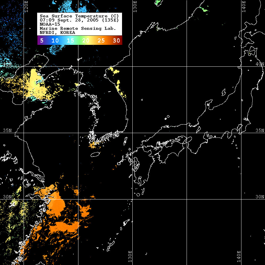 o 2005년 09월 28일 07시 09분 NOAA-15호 위성영상입니다. o 수온분포는 범례를 참고하시기 바랍니다. o 검은색은 구름 또는 육지를 나타냅니다.