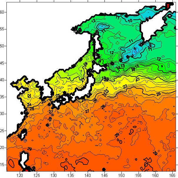 o 2005년 09월 27일 북서태평양 광역해양 수온분포 입니다.