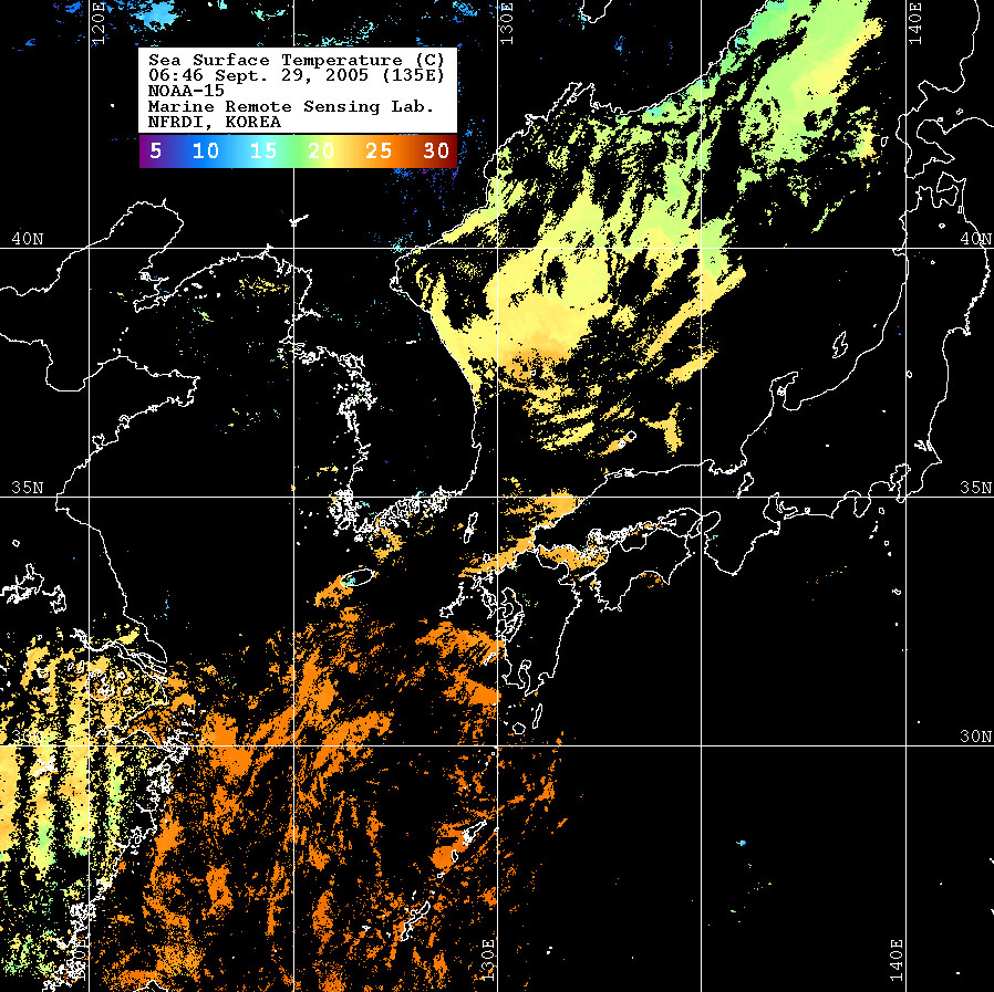 o 2005년 09월 29일 06시 46분 NOAA-15호 위성영상입니다. o 수온분포는 범례를 참고하시기 바랍니다. o 검은색은 구름 또는 육지를 나타냅니다.