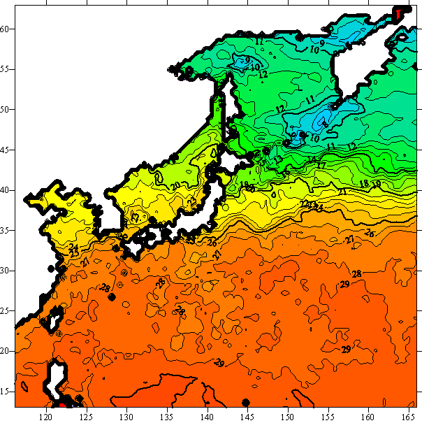 o 2005년 09월 28일 북서태평양 광역해양 수온분포 입니다.
