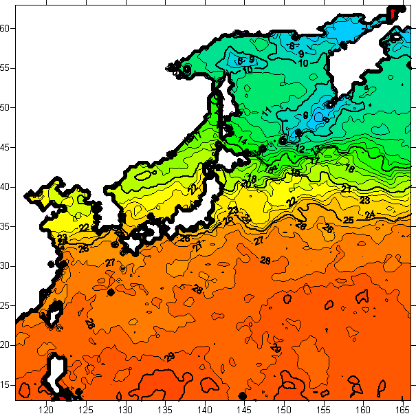 o 2005년 10월 01일 북서태평양 광역해양 수온분포 입니다.