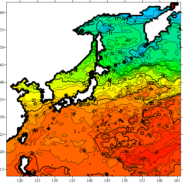 o 2005년 10월 03일 북서태평양 광역해양 수온분포 입니다.