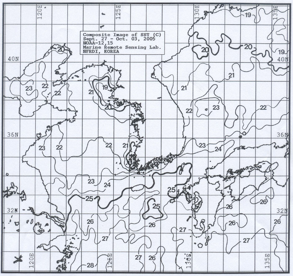 o 금주 (2005.09.27~10.03)의 한국근해 표면수온은 대화퇴 20~22도, 울릉도 근해 21~23도, 대마도 및 제주도 근해 24~26도, 이어도 근해 25~26도, 일향초 근해 23~24도, 어청도 근해 20~22도 내외로 나타납니다. o「평년에 비해」 대화퇴 근해 1도 높게, 울릉도 근해 1.5도 높게, 대마도 0.5도 높게, 제주도 근해 1도 높게, 이어도 근해 2.5도 높게, 일향초 근해 1.5도 높게, 어청도 근해는 비슷하게 나타납니다. o 수온 전선대는 제주해협과 대마도간 해역에서 24도를 중심으로 형성됩니다. < 위의 그림을 클릭하시면 확대된 수온정보를 보실 수 있습니다 >
