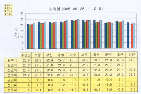 o 금주(2005.09.25~10.01)의 한반도 연안 표면수온은 동해 연안역에서 섭씨