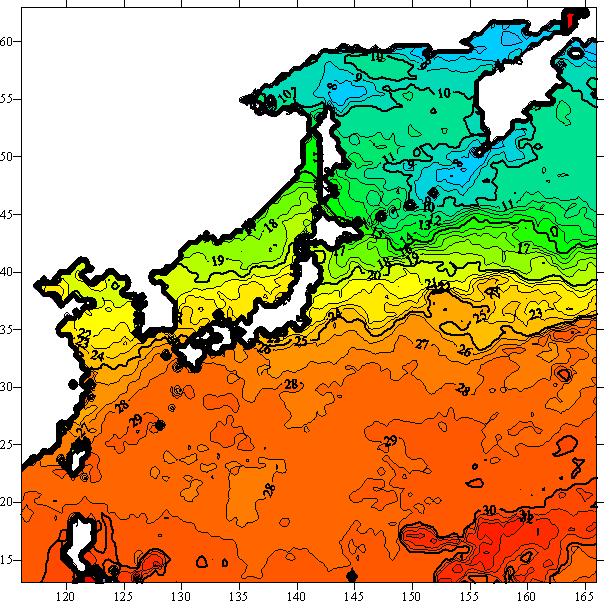 o 2005년 10월 04일 북서태평양 광역해양 수온분포 입니다.