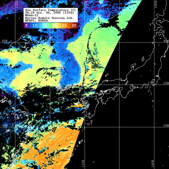 o 2005년 10월 06일 06시 28분 NOAA-12호 위성영상입니다. o 수온분포는 범례를 참고하시기 바랍니다. o 검은색은 구름 또는 육지를 나타냅니다.