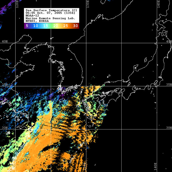 o 2005년 10월 07일 06시 05분 NOAA-12호 위성영상입니다. o 수온분포는 범례를 참고하시기 바랍니다. o 검은색은 구름 또는 육지를 나타냅니다.