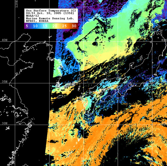 o 2005년 10월 10일 04시 51분 NOAA-12호 위성영상입니다. o 수온분포는 범례를 참고하시기 바랍니다. o 검은색은 구름 또는 육지를 나타냅니다.