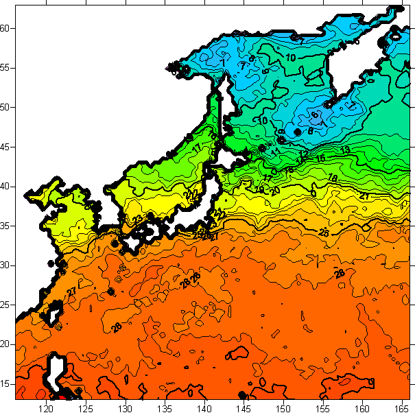 o 2005년 10월 09일 북서태평양 광역해양 수온분포 입니다.