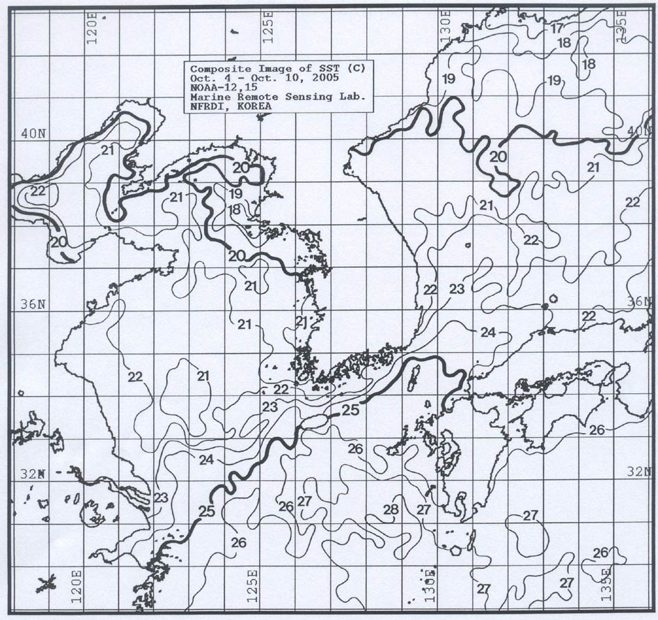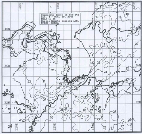 o 금주 (2005.10.04~10.10)의 한국근해 표면수온은 대화퇴 20~22도, 울릉도 근해 22~23도, 대마도 근해 25~26도, 제주도 근해 24~26도, 이어도 근해 25~26도, 일향초 근해 22~23도, 어청도 근해 21도 내외로 나타납니다.