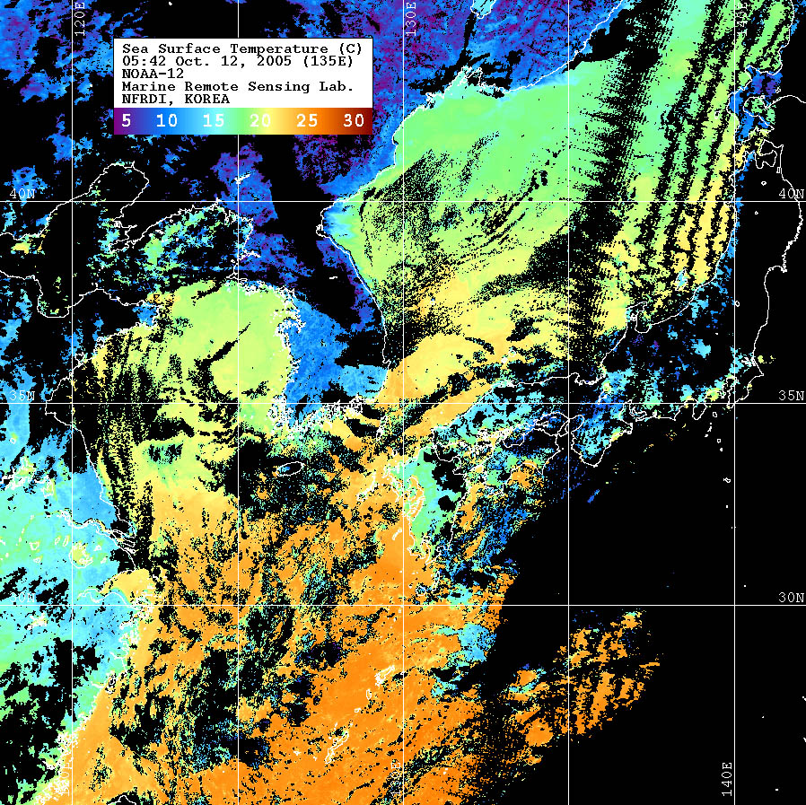 o 2005년 10월 12일 04시 42분 NOAA-12호 위성영상입니다. o 수온분포는 범례를 참고하시기 바랍니다. o 검은색은 구름 또는 육지를 나타냅니다.
