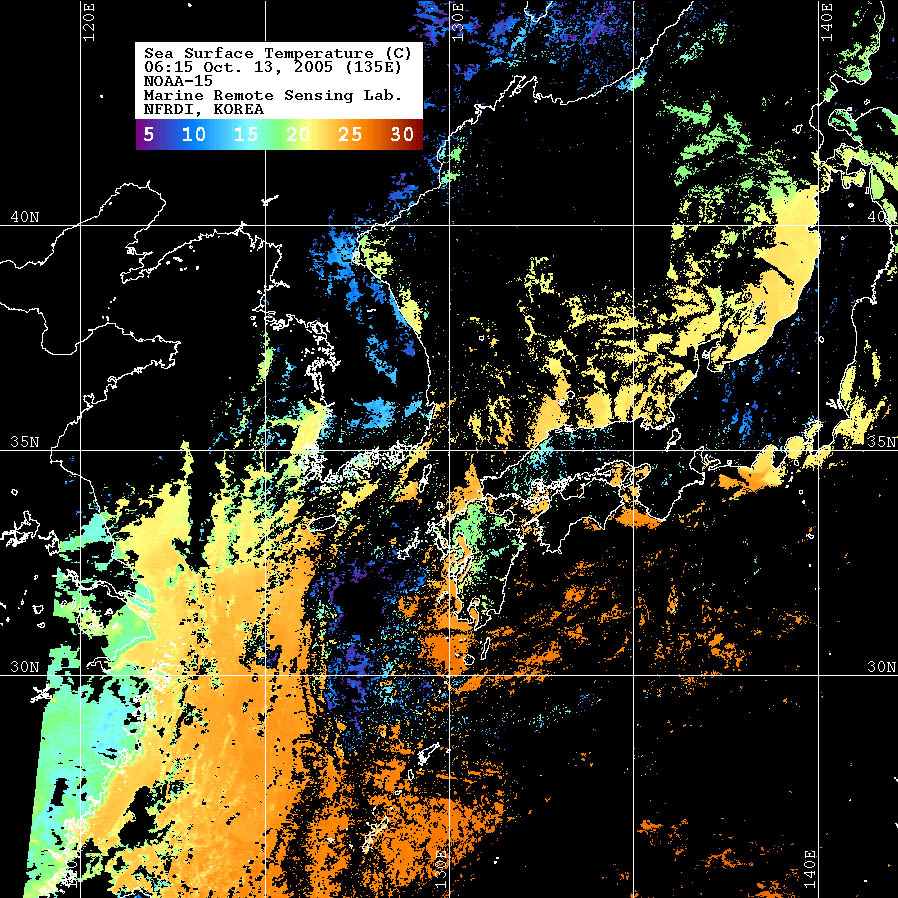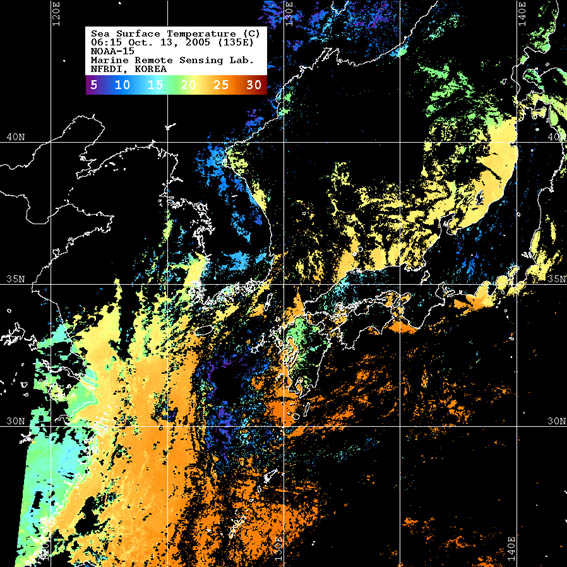 o 2005년 10월 13일 06시 15분 NOAA-15호 위성영상입니다. o 수온분포는 범례를 참고하시기 바랍니다. o 검은색은 구름 또는 육지를 나타냅니다.
