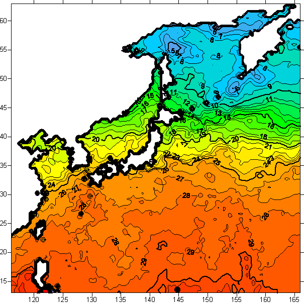o 2005년 10월 13일 북서태평양 광역해양 수온분포 입니다.