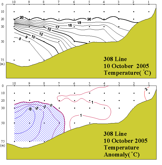 ◦ 2005년 10월 10일 국립수산과학원 서해수산연구소에서 조사한 308선(대천 서방)의 수직수온분포도 및 평년편차도 입니다.