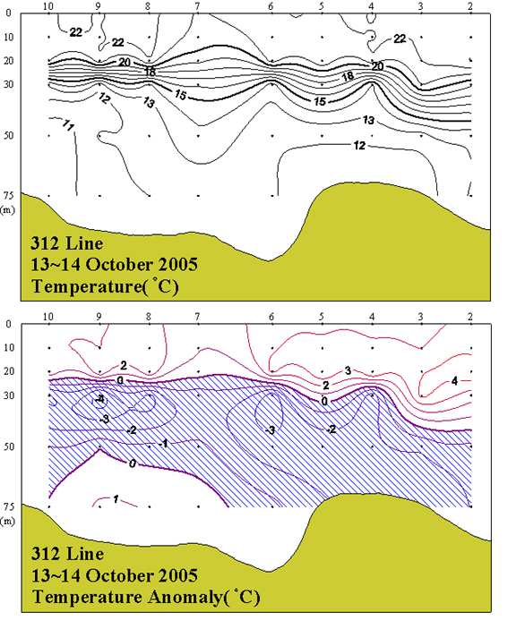 ◦ 2005년 10월 13~14일 국립수산과학원 서해수산연구소에서 조사한 312(제주해협 서방)의 수직수온분포도 및 평년편차도 입니다.