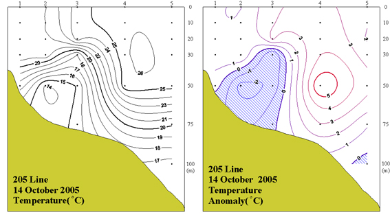 ◦ 2005년 10월 14일 국립수산과학원 남해수산연구소에서 조사한 205선(소리도 남동방)의 수직수온분포도 및 평년편차도 입니다.