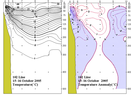 ◦ 2005년 10월 15~16일 국립수산과학원 동해수산연구소에서 조사한 102선(포항 동방)의 수직수온분포도 및 평년편차도 입니다.
